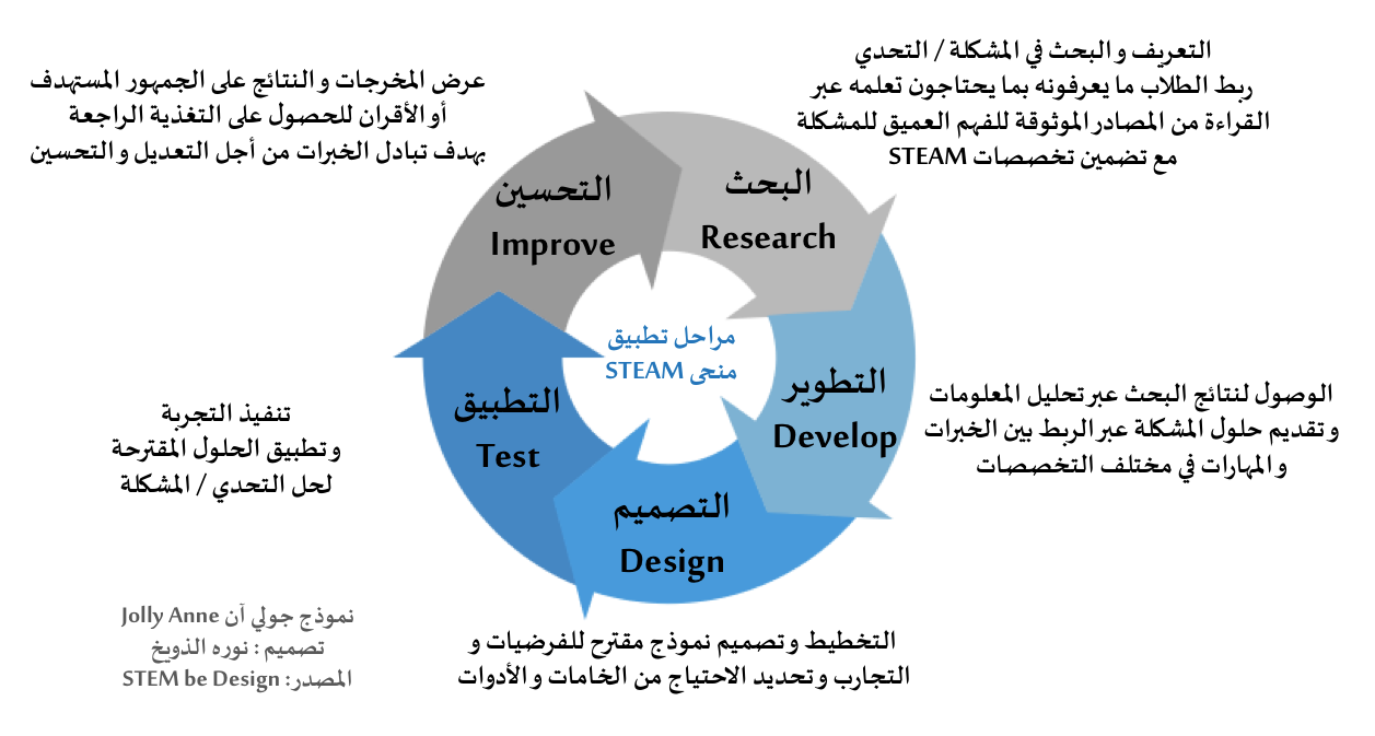 يعتمد التعليم وفق منحى ستيم وفقاً لنموج جولي آن على طرح مشكلة أو تحدي للطلاب يتطلب منهم العمل ضمن فرق تعاونية بمهام محددة للبحث عن معلومات إضافية من المصادر الموثوقة بهدف تعميق المعرفة و الفهم و الربط بين التخصصات المختلفة، و من ثم تحليل المعلومات و تصنيفها و تقديم فرضيات ليتم التخطيط و تصميم نماذج مقترحة للتجارب و تحديد الخامات و الأدوات اللازمة، ومن ثم العمل لتنفيذ و تطبيق الأفكار و الحلول المقترحة و التي تسهم بحل المشكلات المطروحة في التحدي ليتم عرضها في نهاية المطاف على الفئة المستهدفة و الأقران بهدف تحقيق الفائدة و الحصول على التغذية الراجعة للتحسين في العمليات و الأداء.