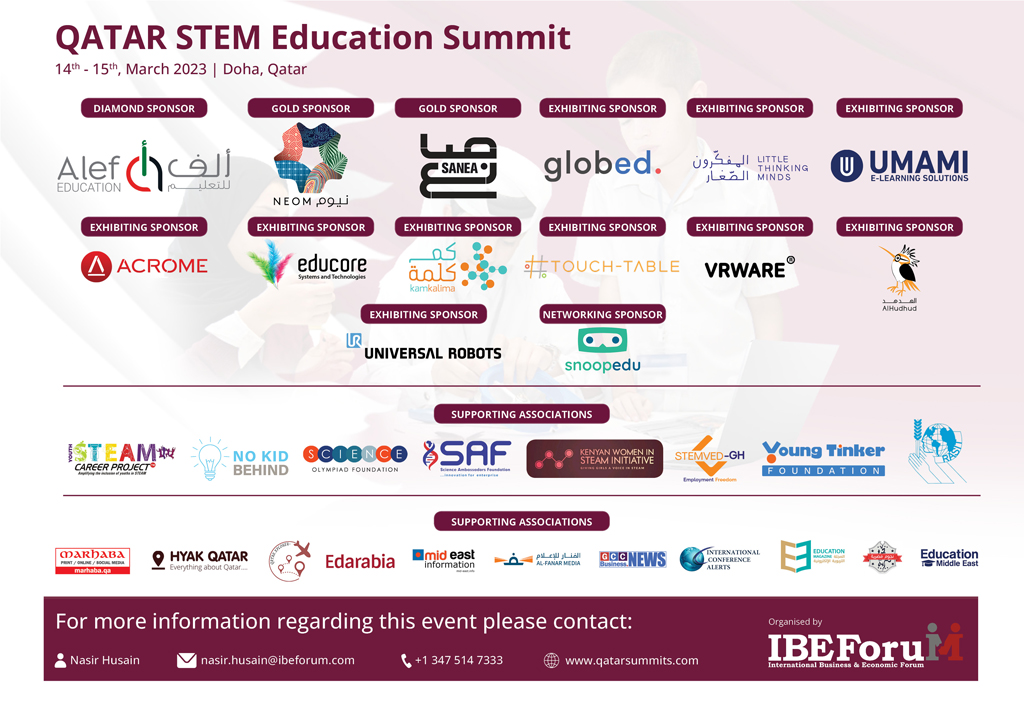 تنطلق هذا الأسبوع قمة قطر للعلوم والتكنولوجيا والهندسة والرياضيات (STEM) بمركز قطر الوطني للمؤتمرات في الدوحة وذلك في الفترة من 14 إلى 15 مارس 2023. ويتخذ هذا المؤتمر أهمية عالمية إذ يعتبر رائداً في مجالات ستيم لاستكشاف والاحتفاء بأهمية تعليم ستيم. ويجمع الحدث وزارة التربية والتعليم ومؤسسة قطر وجامعة قطر ومدارس وجامعات رائدة من جميع