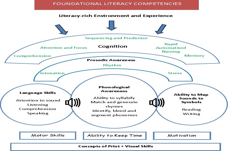الأسس التي يحتاجها الأطفال للنجاح في تعلم اللغة الإنجليزية هي نفسها التي يحتاجها متعلمو اللغة الثانية ومتعلمو اللغة الأولى، فيجب أن تسبق اللغة المنطوقة اللغة المكتوبة، ومن الضروري أن يمتلك الأطفال المفردات والفهم اللازمين للغة الهدف قبل أن يبدأوا في ربط أصوات اللغة بالحروف، ولا يمكن ربط أصوات اللغة بدونها. فعندما يلتحق الأطفال بمرحلة ما قبل المدرسة، غالبًا ما يكون هناك فهم محدود لما يحتاجه الأطفال لتسهيل نجاحهم في تعلم القراءة والكتابة (رود، 2015)، وقد يعتقد معلمو اللغة غالبا أن تعليم الحروف هو نقطة البداية. وكما يتضح من الشكل 2، هناك مجموعة متنوعة من الكفاءات التي تدعم النجاح في تعلم القراءة والكتابة، وهي متوافرة قبل تعلم القراءة والكتابة الرسمي لأولئك الذين يبدو أنهم يتقنون بسهولة ما هو مطلوب. سيستوعب الأطفال ذوو الخبرة السابقة في القراءة والكتابة المعرفة بالكتابة (كتابة الأحرف وربطها بالأصوات)، ويتعلمون مفاهيم الكتابة قبل دخول المدرسة، ولكن لا يمُكن افتراض ذلك لجميع الأطفال، فقد يكتسب أو لا يكتسب الأطفال الكفاءات الداعمة.